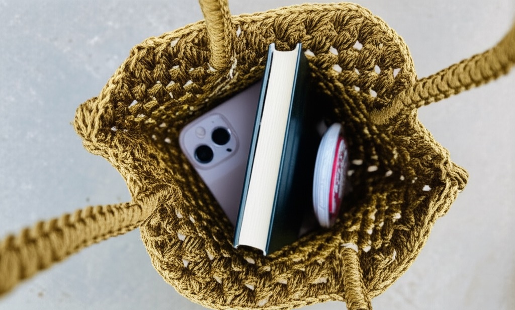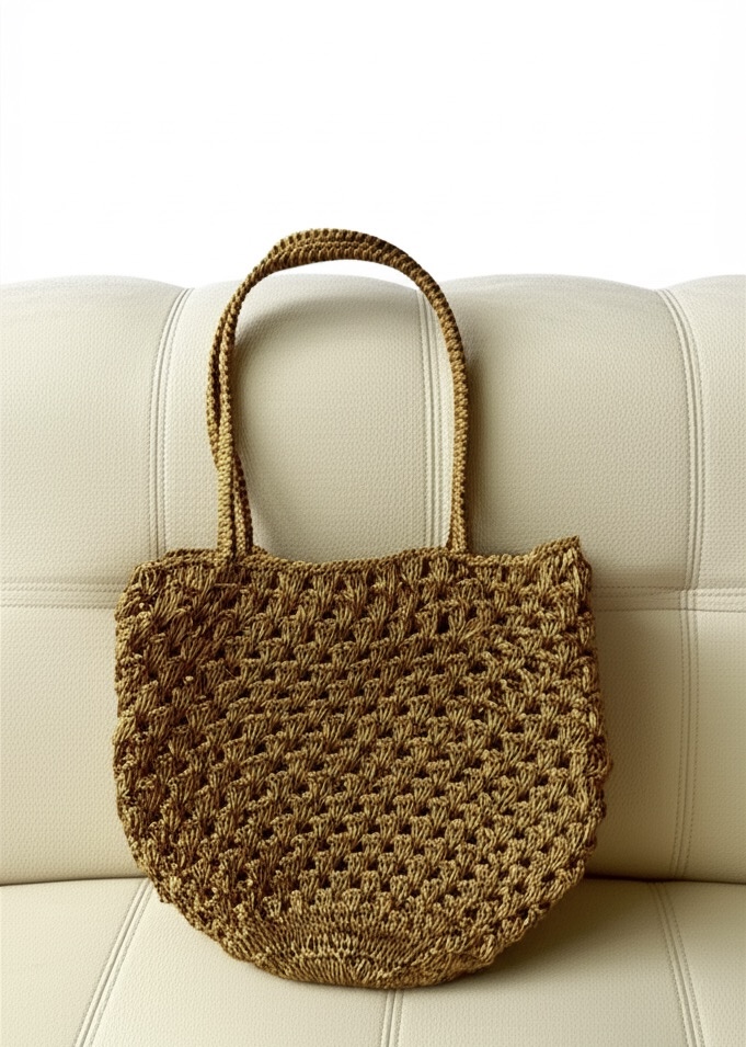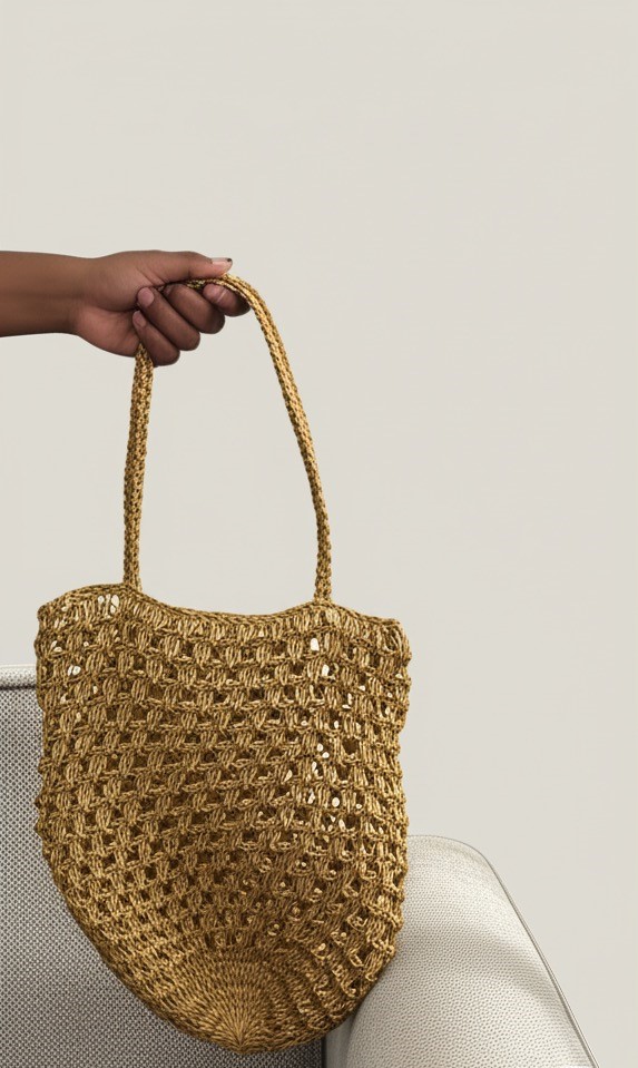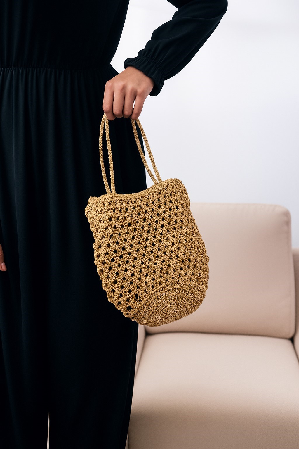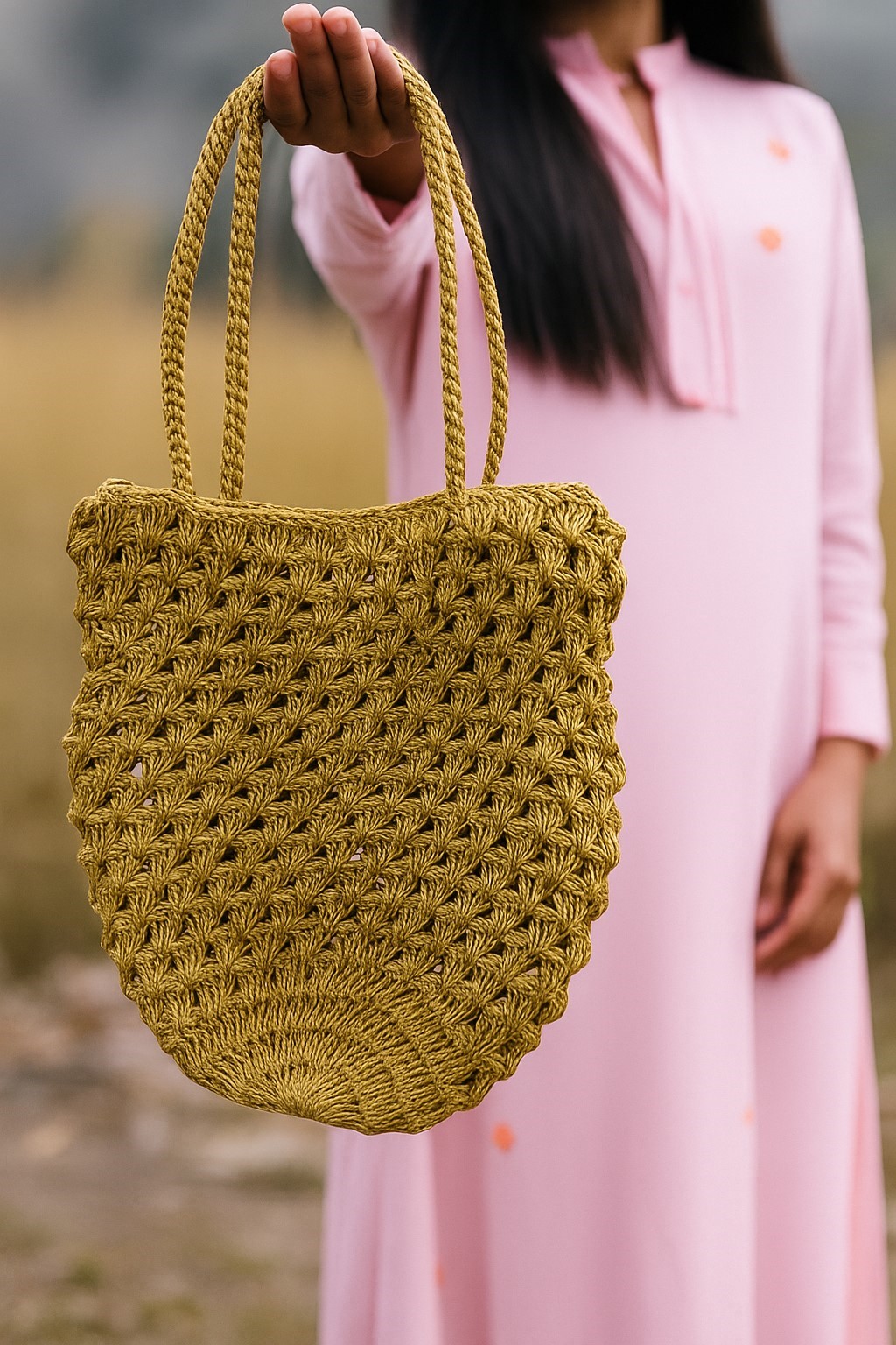 - ✅ Handwoven macramé design with a rich golden finish ✅ Eco-friendly polyester cord (durable & lightweight) ✅ Spacious mesh body with a soft open-top structure ✅ Dual strong handles for easy hand carry ✅ Perfect for daily use, casual outings, or gifting Handwoven with durable shiny cord Mesh-style expandable body Dual hand-wrapped sturdy handles Lightweight and eco-friendly Seamless round base design Ideal for casual use, shopping, or gifting