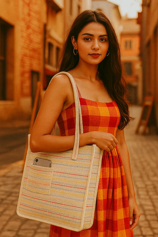 Lidloom Creations Handwoven Eco-Friendly Cotton Tote Bag – Made in India Upgrade your everyday style with our handcrafted, eco-conscious tote bag – designed for modern life and traditional values. Each bag is lovingly handwoven by local artisans using premium-quality recycled cotton, offering durability, elegance, and sustainability in one package.